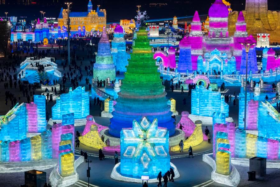 5日、ハルビン氷雪大世界の夜景。(ドローンから、ハルビン=新華社記者/王松)