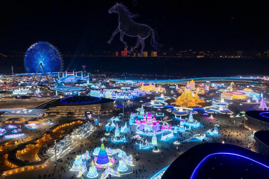 5日、ハルビン氷雪大世界で行われたドローンショー。(ドローンから、ハルビン=新華社記者/張濤)
