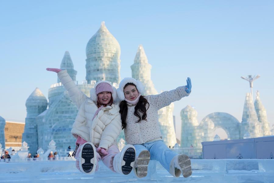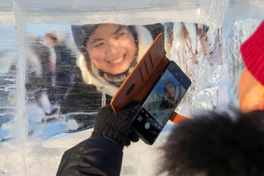 5日、ハルビン氷雪大世界で撮影を楽しむ観光客。(ハルビン=新華社記者/王建威)