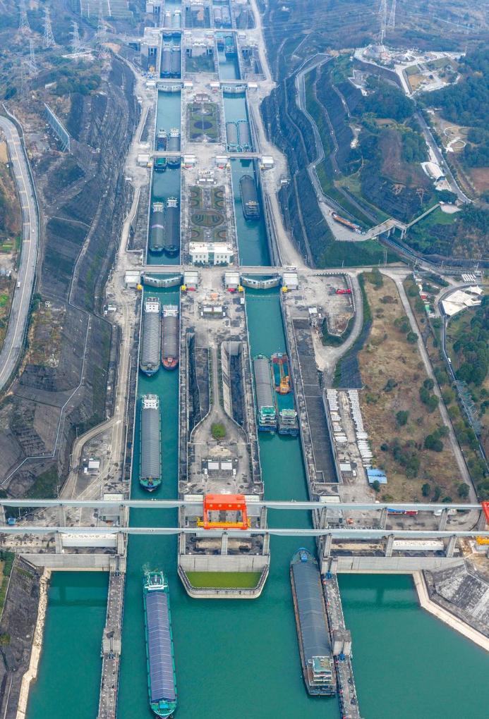 1日、三峽ダムの雙方向五段式閘門を整然と通過する船舶。(ドローンから、宜昌=新華社配信/王罡)