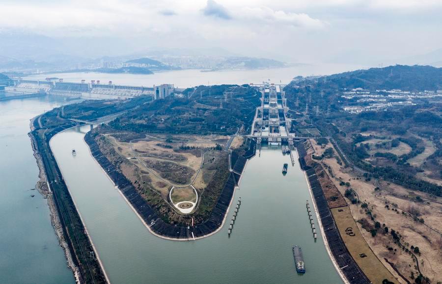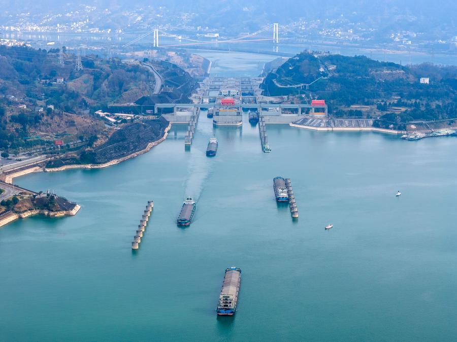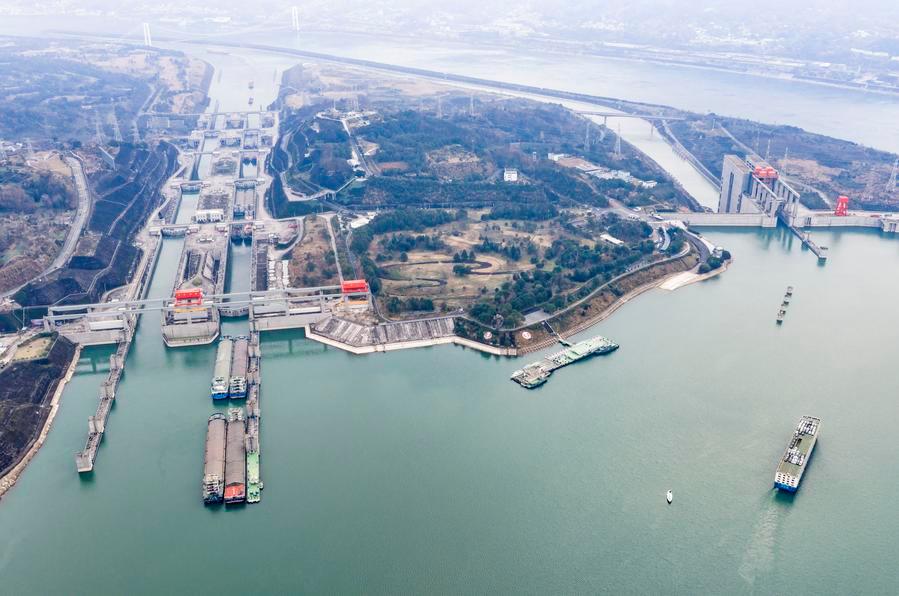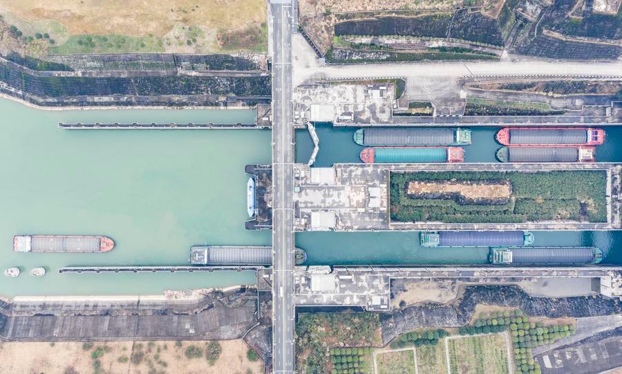 1日、三峽ダムの雙方向五段式閘門と船舶昇降機を整然と通過する船舶。(ドローンから、秭帰=新華社配信/鄭家裕)