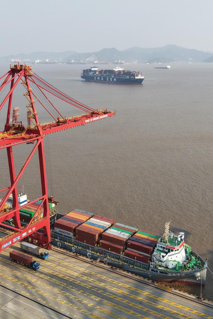 8日、寧波舟山港穿山港區の埠頭。(寧波=新華社記者/黃宗治)
