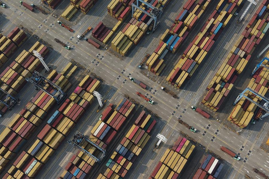 8日、寧波舟山港穿山港區のコンテナ埠頭貨物ヤード。(ドローンから、寧波=新華社記者/黃宗治)