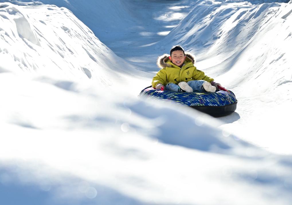 10日、祁連県の阿咪東索林海キャンプ場で氷雪アクティビティーを體験する子ども。(祁連=新華社記者/斉芷玥)