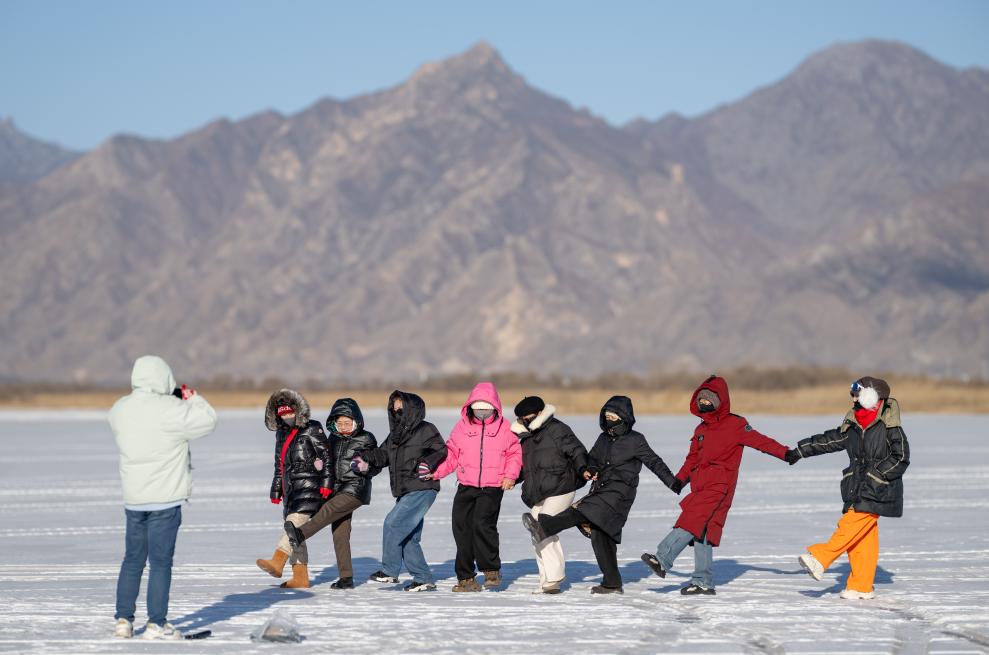 10日、フフホト市內の湖、哈素海で行われた冬季漁祭りの會場を歩く子ども。(フフホト=新華社記者/連振)