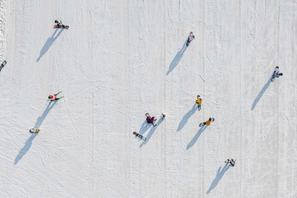 フフホト市の馬鬃(ばそう)山スキー場で滑りを楽しむ人たち。(2025年12月14日、ドローンから、フフホト=新華社記者/李志鵬)