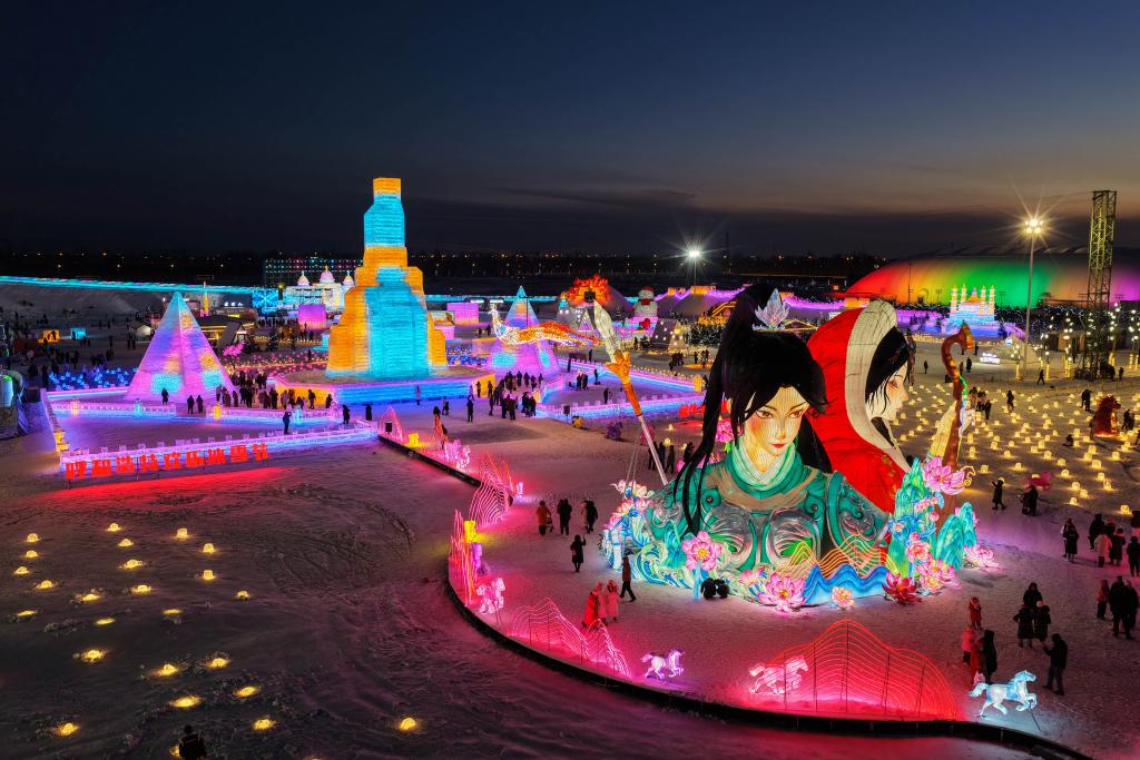 フフホト氷雪祭りの會場を散策する人點。(2025年12月31日、ドローンから、フフホト=新華社記者/連振)