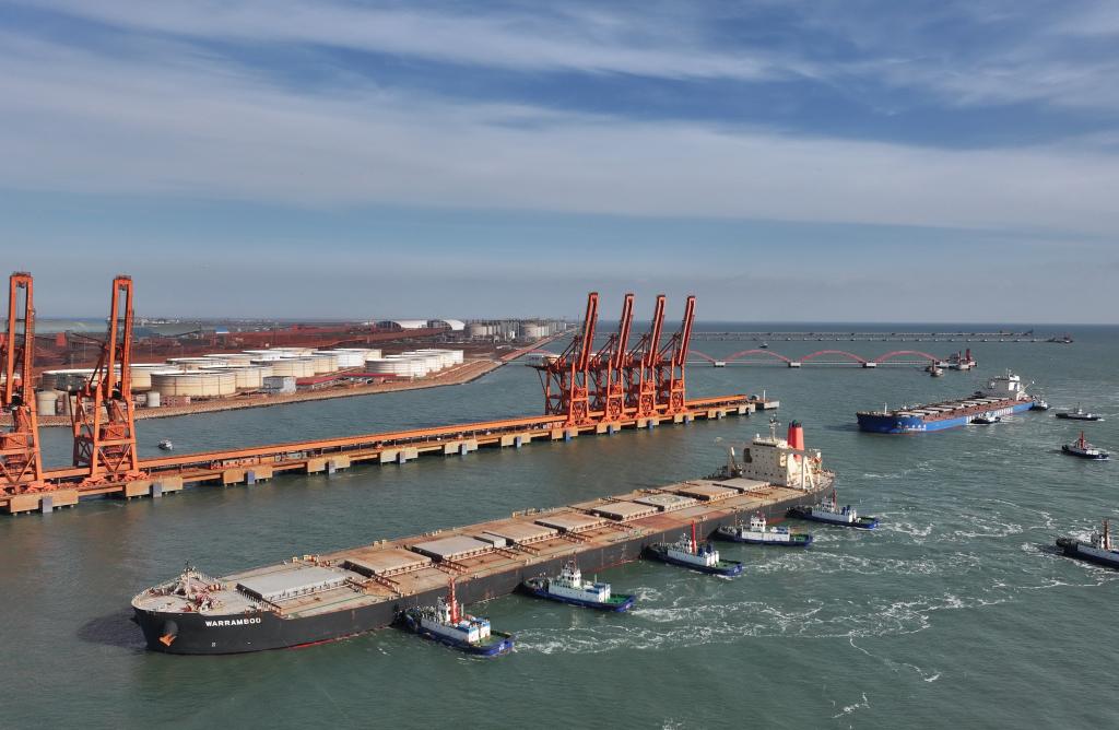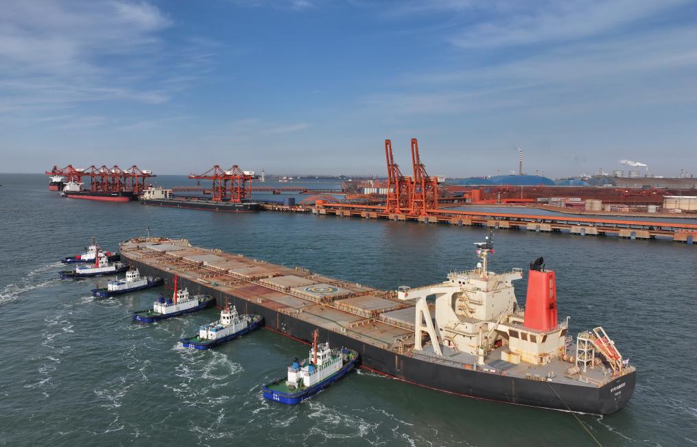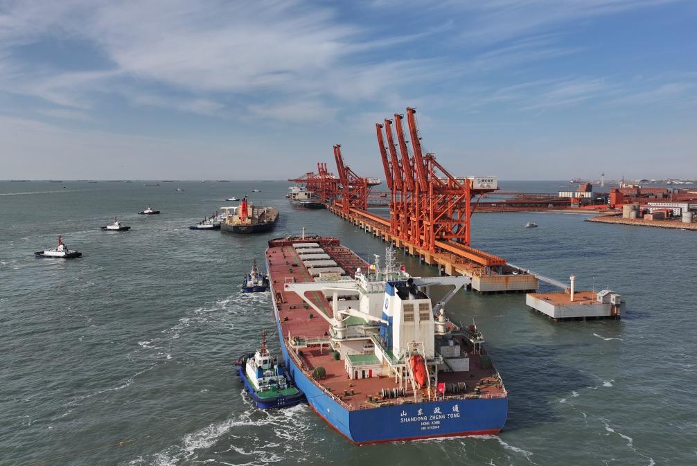 13日、タグボートの支援を受け、唐山港曹妃甸港區の鉱石埠頭(ふとう)に接岸する貨物船。(ドローンから、唐山=新華社記者/楊世尭)