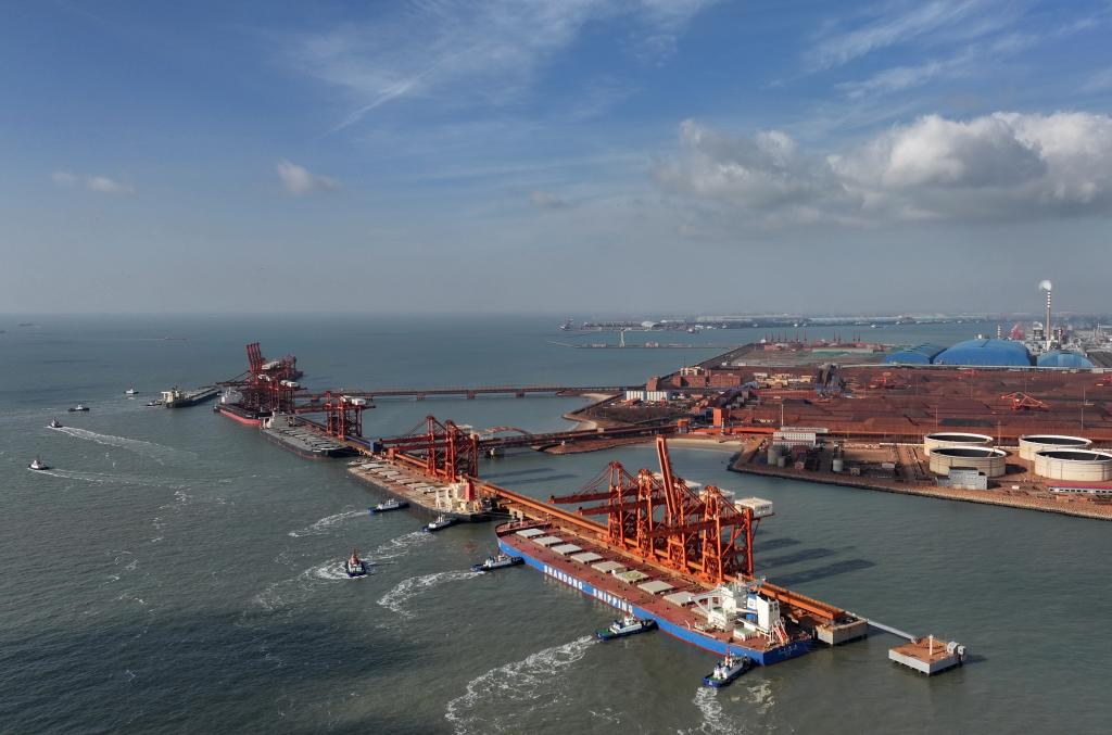 13日、唐山港曹妃甸港區の鉱石埠頭(ふとう)に停泊し、荷降ろし作業を行う貨物船。(ドローンから、唐山=新華社記者/楊世尭)
