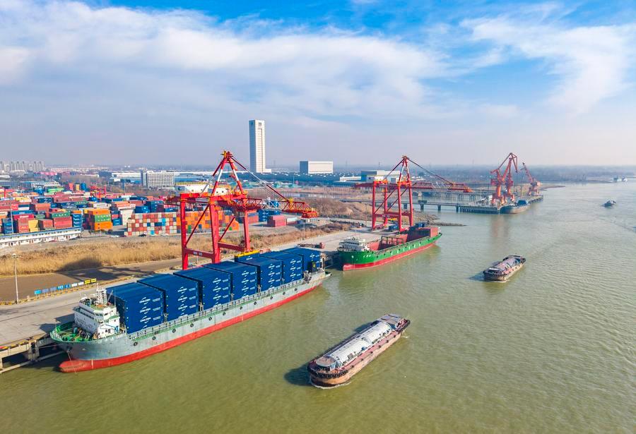 14日、江蘇省の揚州港。(ドローンから、揚州=新華社配信/任飛)