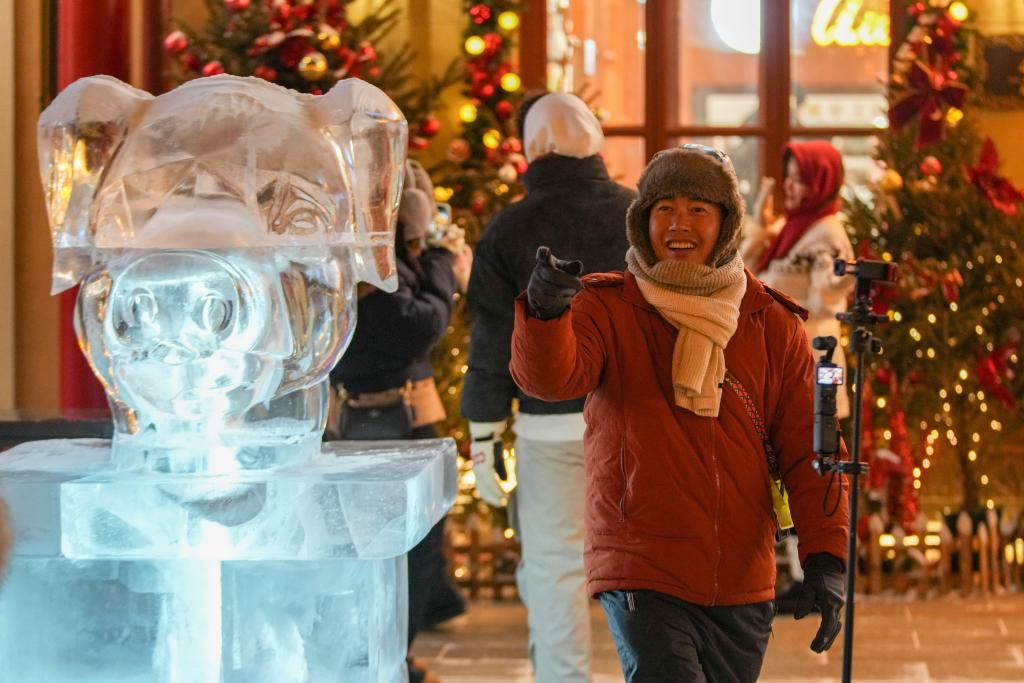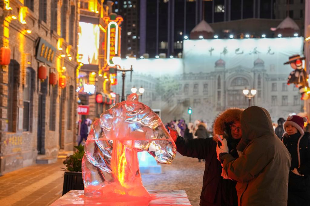 13日、中華バロック歴史文化街區で動物をモチーフにした氷彫刻を見る観光客。(ハルビン=新華社記者/王建威)