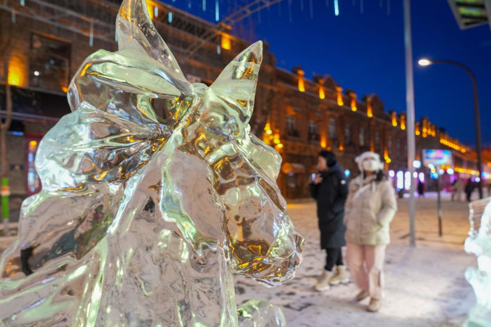 13日、中華バロック歴史文化街區に設置されている氷彫刻。(ハルビン=新華社記者/王建威)
