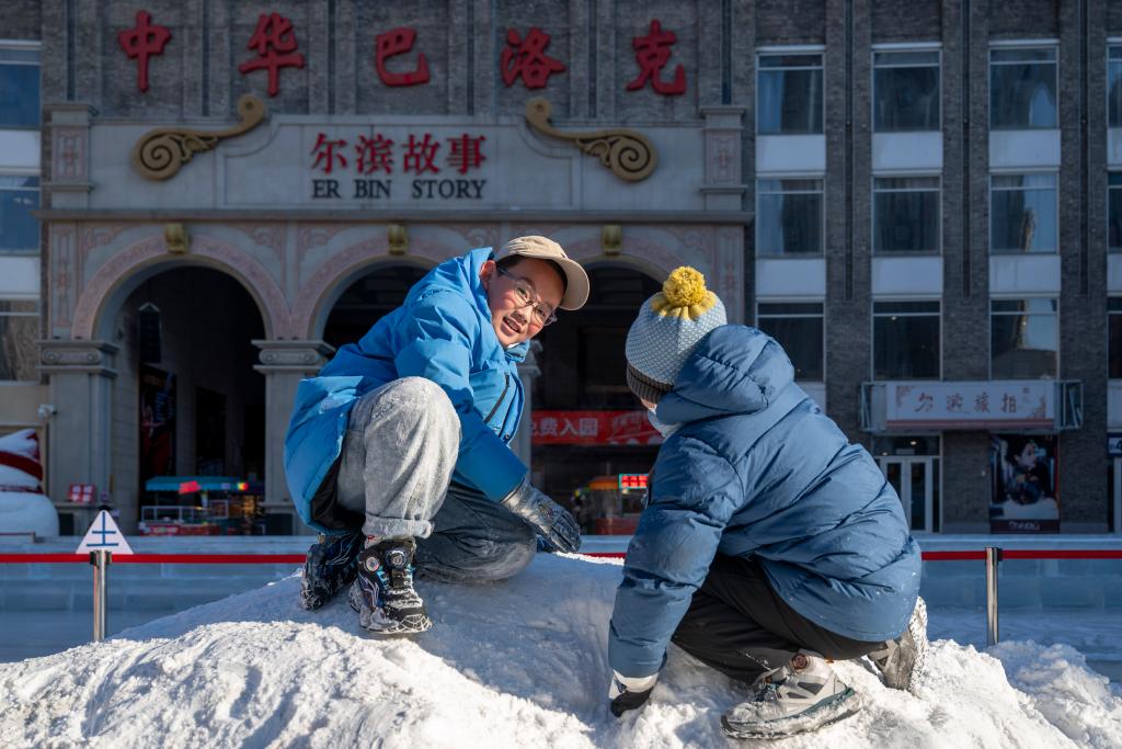 14日、中華バロック歴史文化街區で雪遊びをする子どもたち。(ハルビン=新華社記者/張濤)