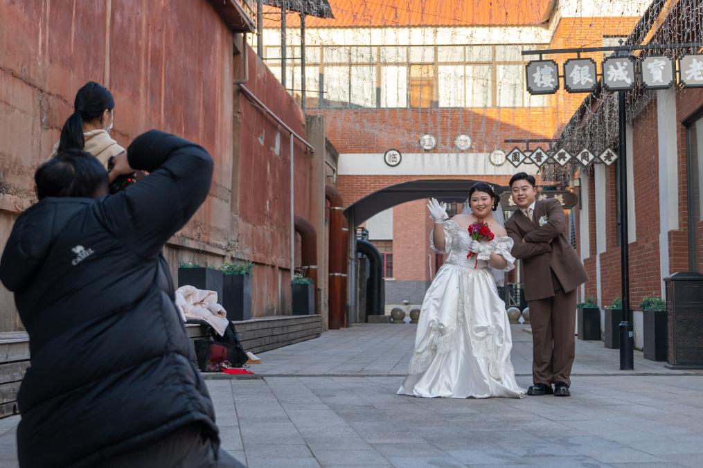 7日、沙市洋碼頭文創園でウエディングフォトを撮るカップル。(荊州=新華社記者/杜子璇)