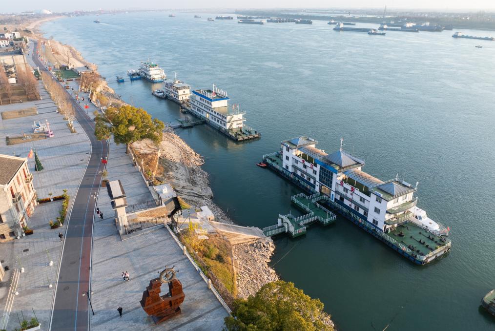 7日、長江沿いに整備された沙市洋碼頭文創園。(ドローンから、荊州=新華社記者/杜子璇)