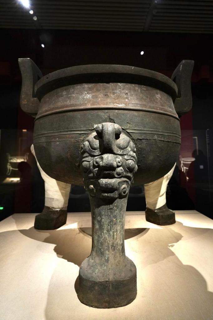 14日、「安徽淮南武王墩1號墓考古成果展」で展示された青銅鑊鼎(かくてい)。(北京=新華社記者/許蕓潁)