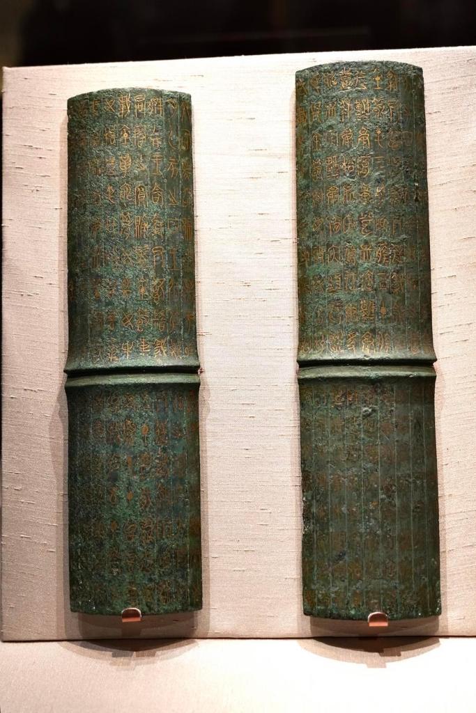 14日、「安徽淮南武王墩1號墓考古成果展」で展示された「鄂君啓」錯金青銅節。(北京=新華社記者/許蕓潁)