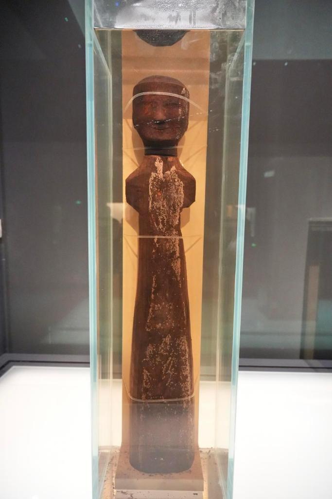 14日、「安徽淮南武王墩1號墓考古成果展」で展示された木俑。(北京=新華社記者/許蕓潁)