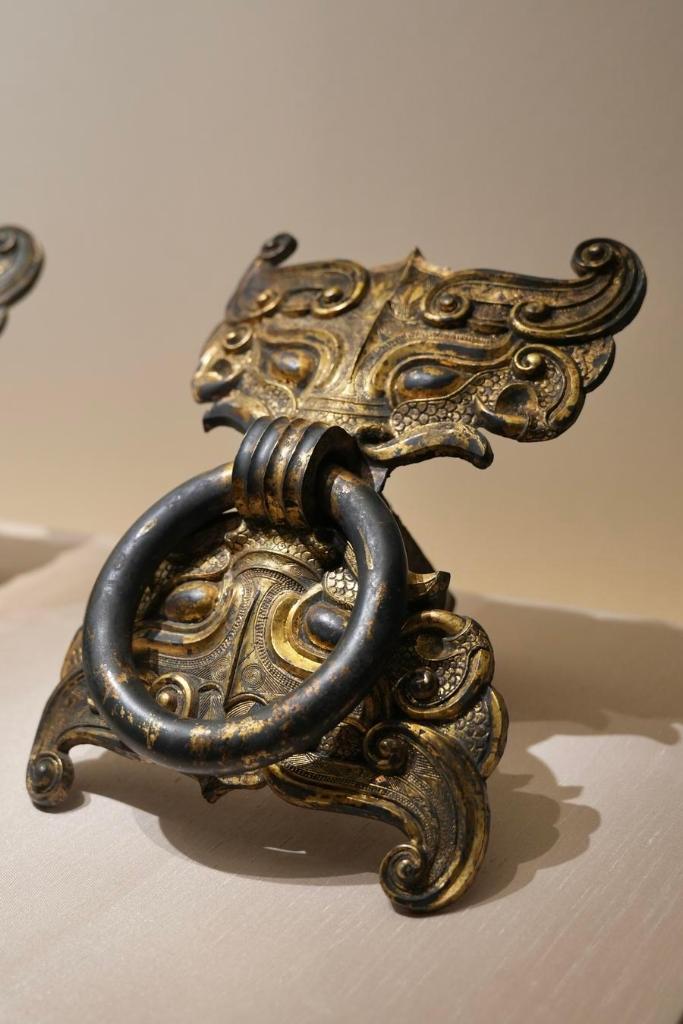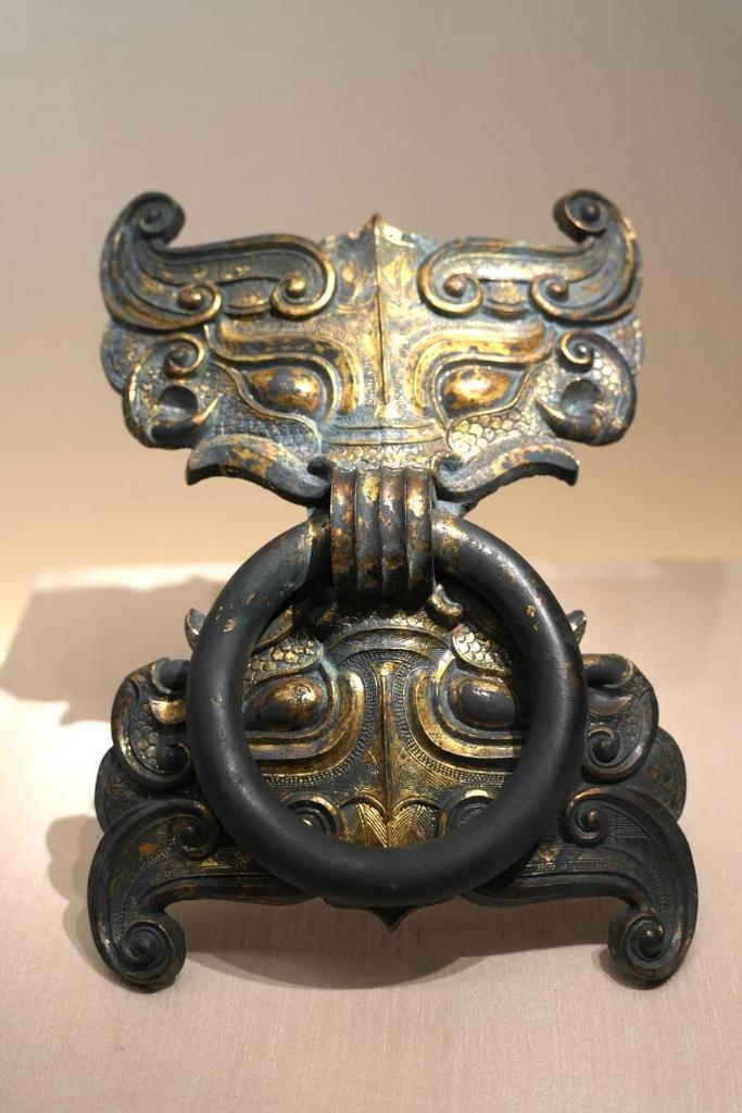 14日、「安徽淮南武王墩1號墓考古成果展」で展示された青銅鼓環。(北京=新華社記者/許蕓潁)