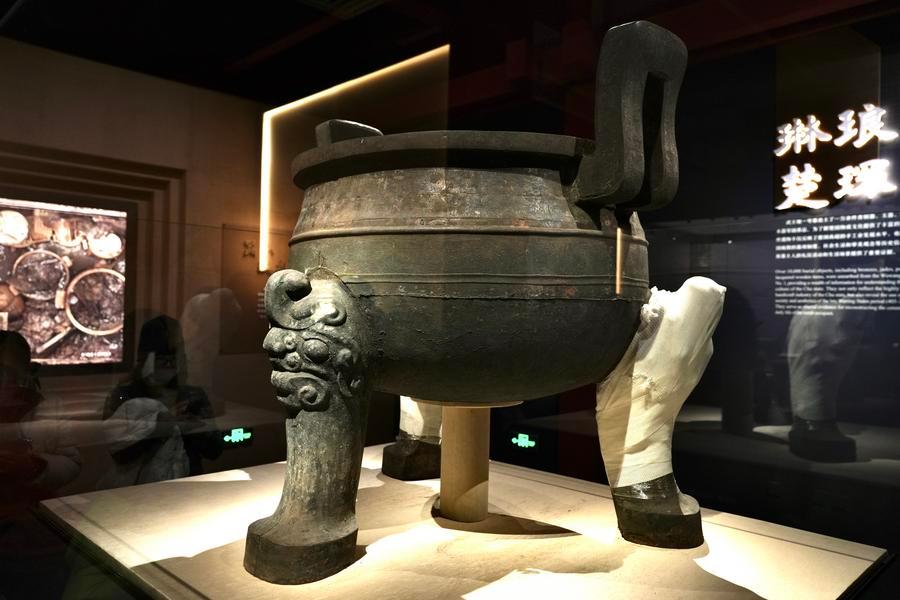 14日、「安徽淮南武王墩1號墓考古成果展」で展示された青銅饋鼎(きてい)。(北京=新華社記者/許蕓潁)