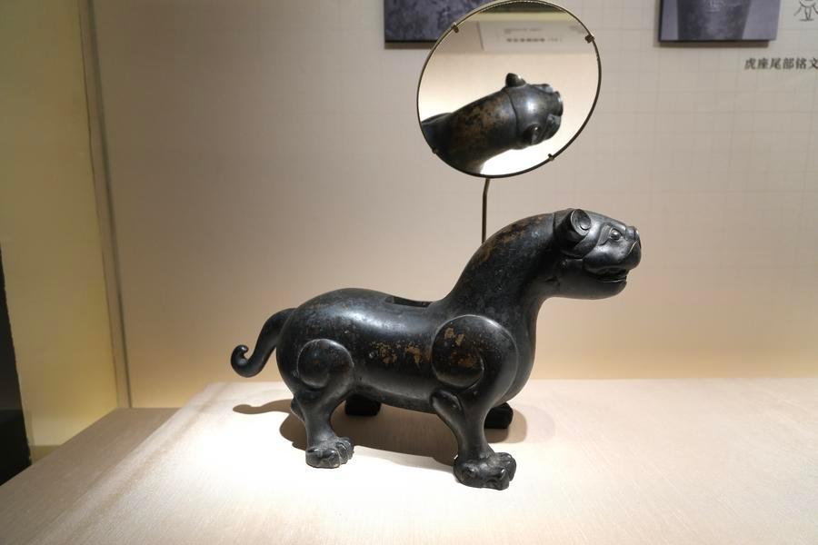 14日、「安徽淮南武王墩1號墓考古成果展」で展示された青銅鑑。(北京=新華社記者/許蕓潁)