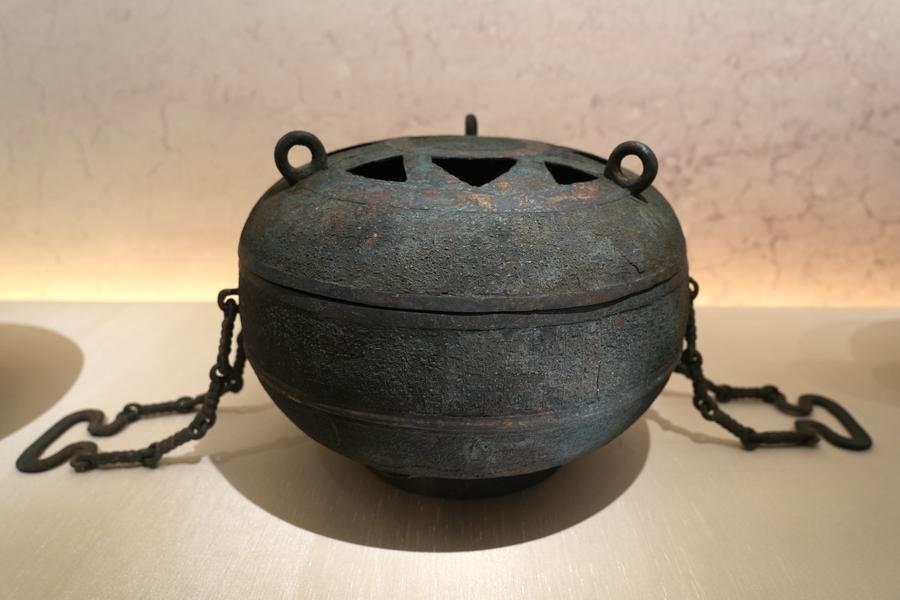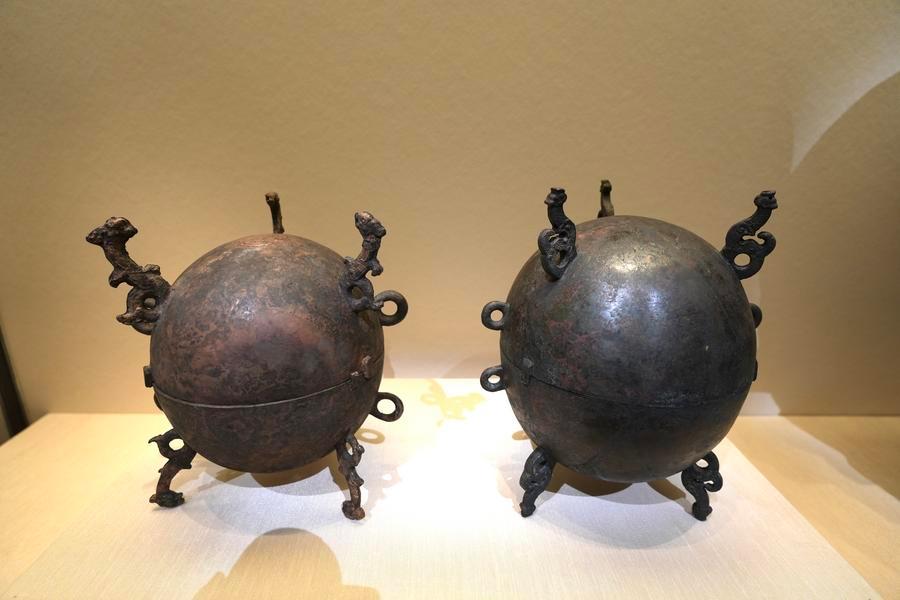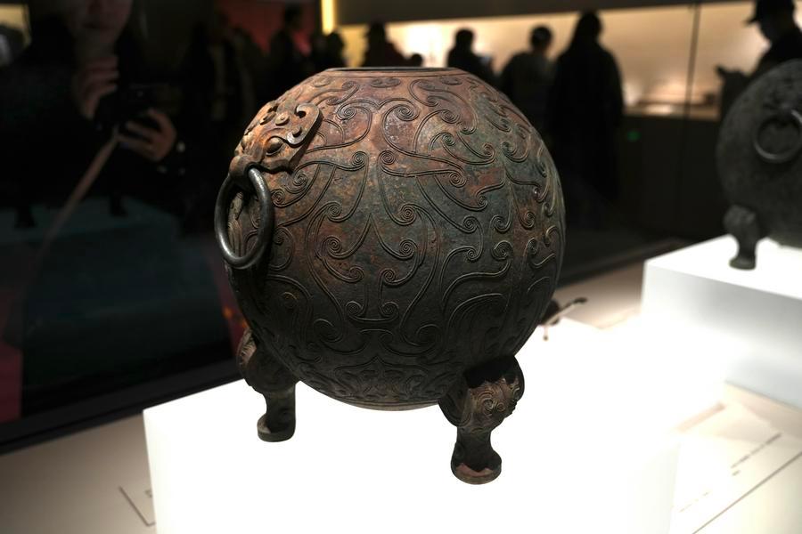 14日、「安徽淮南武王墩1號墓考古成果展」で展示された球形青銅甕(おう)。(北京=新華社記者/許蕓潁)
