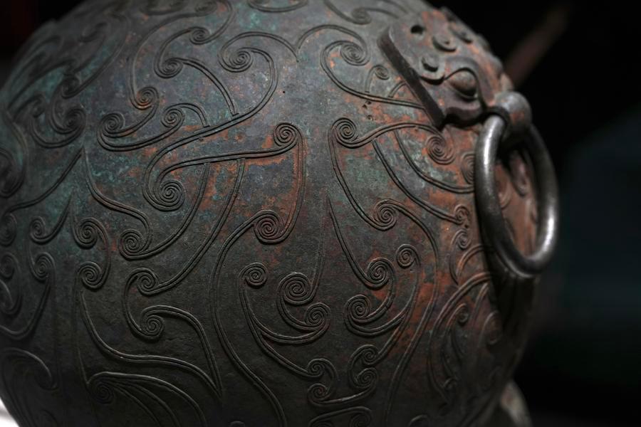 14日、「安徽淮南武王墩1號墓考古成果展」で展示された青銅円壺。(北京=新華社記者/許蕓潁)