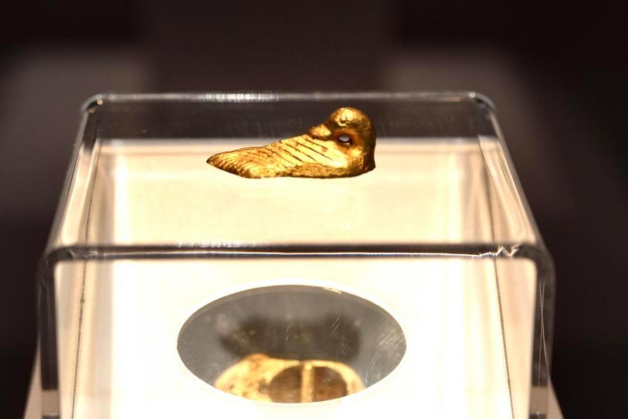 14日、「安徽淮南武王墩1號墓考古成果展」で展示された鴨型金飾。(北京=新華社記者/許蕓潁)