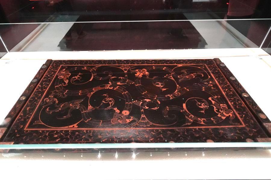 14日、「安徽淮南武王墩1號墓考古成果展」で展示された彩絵竜鳳文漆木案。(北京=新華社記者/許蕓潁)