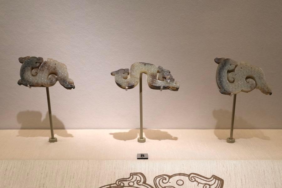 14日、「安徽淮南武王墩1號墓考古成果展」で展示された玉竜形飾。(北京=新華社記者/許蕓潁)