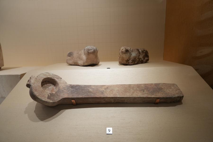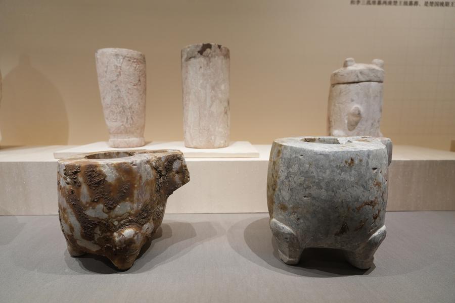 14日、「安徽淮南武王墩1號墓考古成果展」で展示された石器。(北京=新華社記者/許蕓潁)