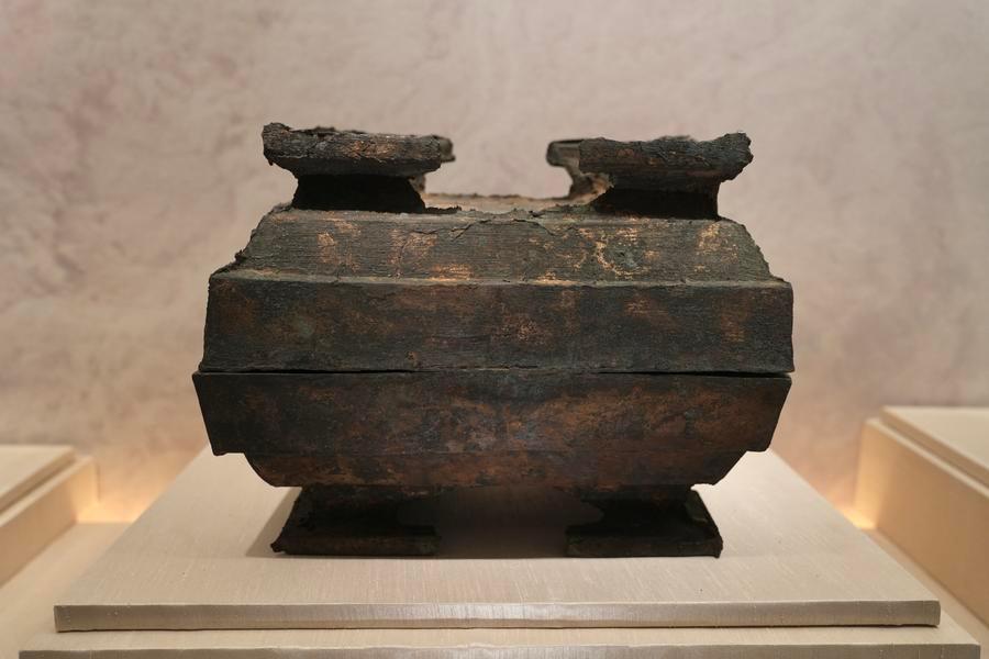 14日、「安徽淮南武王墩1號墓考古成果展」で展示された青銅簠(ほ)。(北京=新華社記者/許蕓潁)