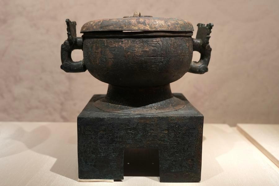 14日、「安徽淮南武王墩1號墓考古成果展」で展示された方底青銅簋(き)。(北京=新華社記者/許蕓潁)