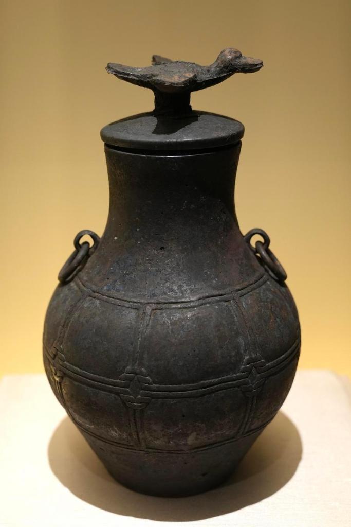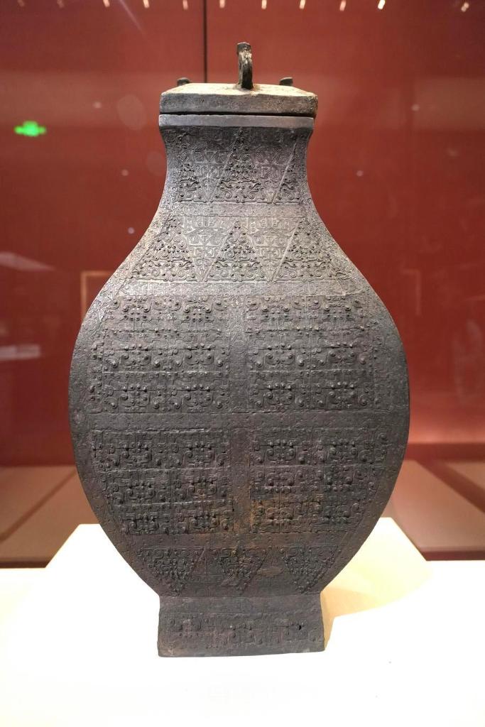 14日、「安徽淮南武王墩1號墓考古成果展」で展示された青銅方壺。(北京=新華社記者/許蕓潁)