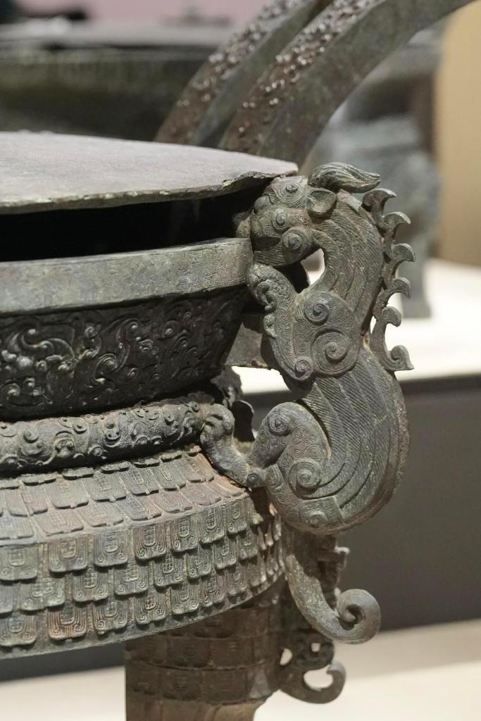 14日、「安徽淮南武王墩1號墓考古成果展」で展示された青銅昇鼎(しょうてい)。(北京=新華社記者/許蕓潁)