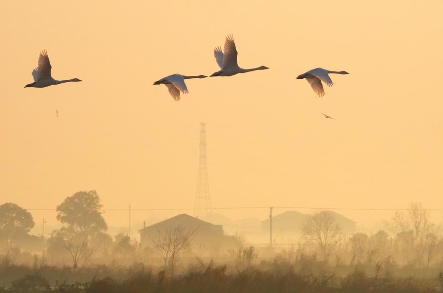 14日、東古湖濕地の上空を飛ぶ渡り鳥。(岳陽=新華社配信/曹正平)