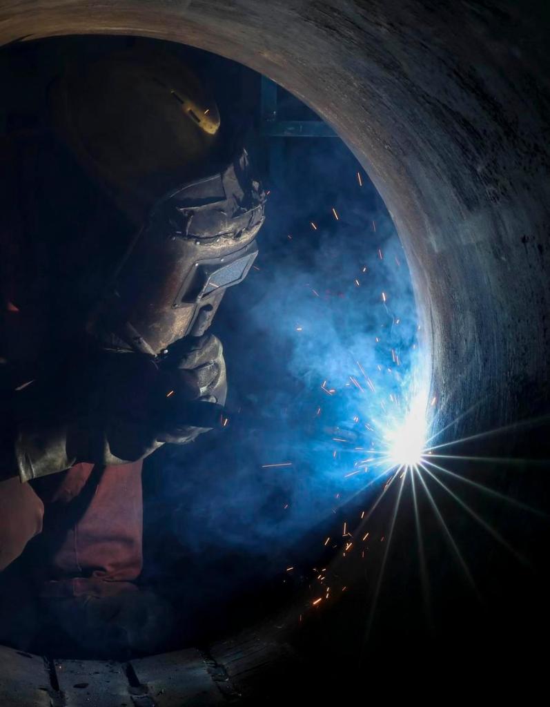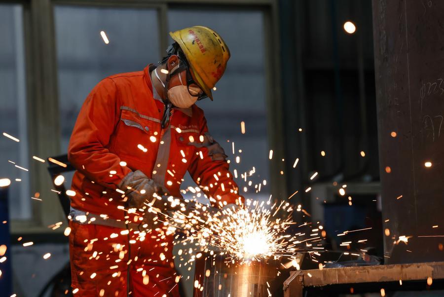 19日、湖北省武漢市にある鉄道建設機械の製造などを手がける中國中鉄科工集団の武漢江夏製造拠點で、シールドマシンの部品を溶接する従業員。(武漢=新華社配信/趙軍)