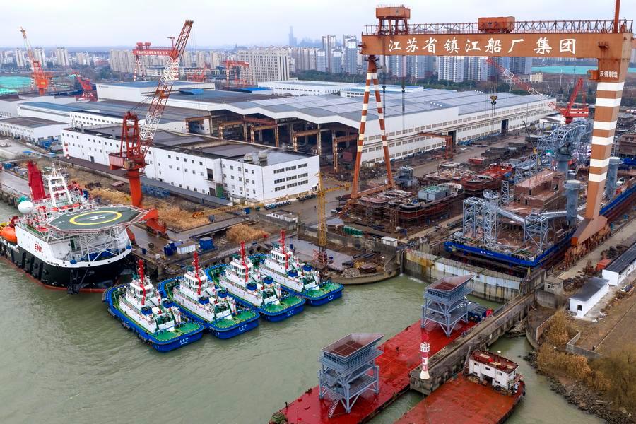 19日、江蘇省鎮江船廠で進む造船作業。(ドローンから、鎮江=新華社配信/辛一)