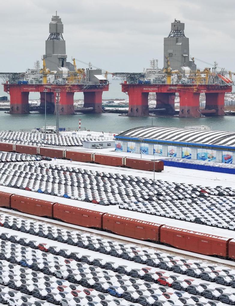 18日、山東省煙&港の埠頭(ふとう)で輸出を待つ國産自動車。(ドローンから、煙&=新華社配信/唐克)