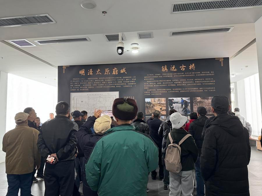 16日、鎮遠橋遺跡館で展示パネルを見る人たち。(太原=新華社記者/王學濤)