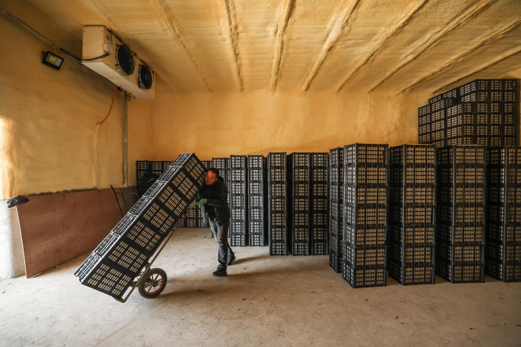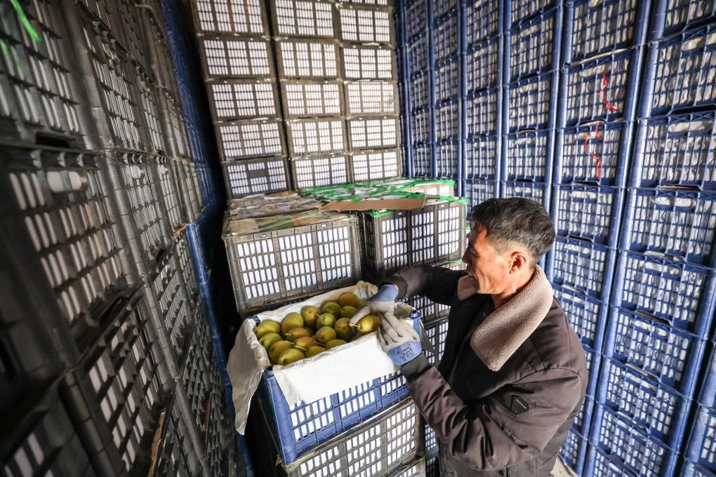 20日、祝家溝村に新たに建設された定溫倉庫で出荷用果物を運ぶ住民。(葫蘆島=新華社記者/潘昱竜)