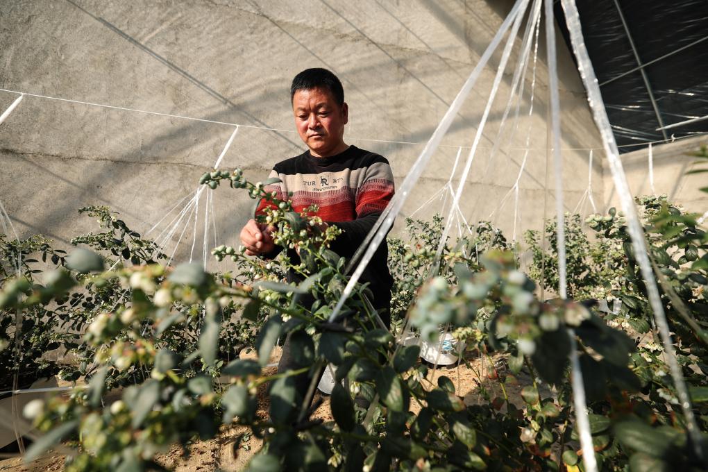 20日、祝家溝村に新たに建設されたブルーベリー栽培用溫室で苗木の世話をする住民。(葫蘆島=新華社記者/潘昱竜)