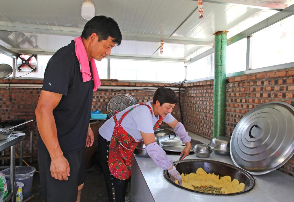 「農家楽(アグリツーリズム)」の利用客に晝食の準備をする祝家溝村の住民。(2025年7月2日撮影、葫蘆島=新華社配信/田嘉)