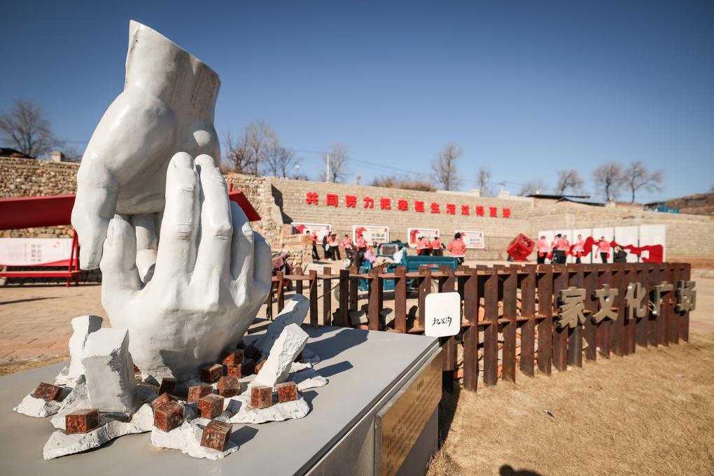 20日、祝家溝村の文化広場前に設置された彫刻。(葫蘆島=新華社記者/潘昱竜)