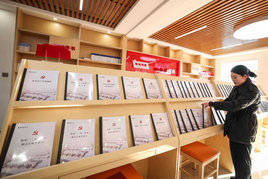 20日、祝家溝村黨群サービスセンターの活動室で展示資料を整理する同村の王麗麗(おう・れいれい)共産黨支部書記。(葫蘆島=新華社記者/潘昱竜)