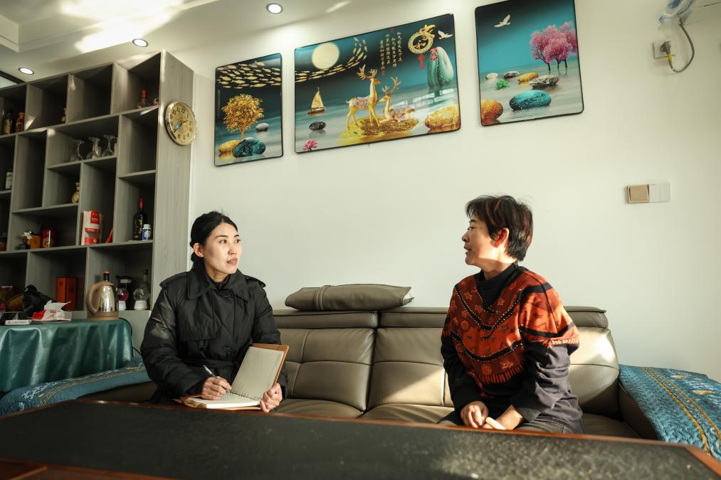 20日、住民の家を訪問し最近の生活狀況を調查する祝家溝村の王麗麗(おう・れいれい)共産黨支部書記(左)。(葫蘆島=新華社記者/潘昱竜)