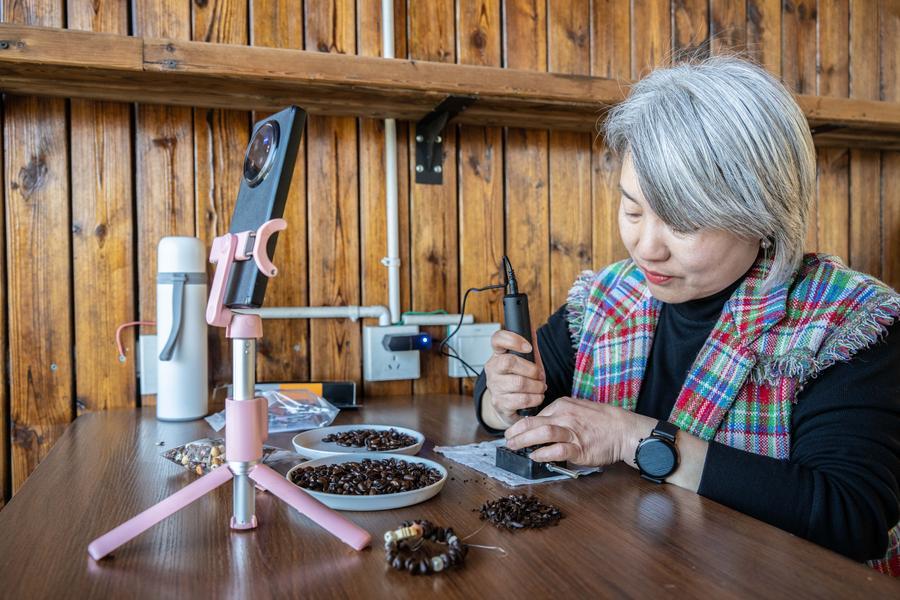 22日、臨滄市臨翔區圏內郷の雲佳コーヒー農園でコーヒー豆の手作りブレスレット製作風景をライブ配信する従業員。(臨滄=新華社記者/高咏薇)