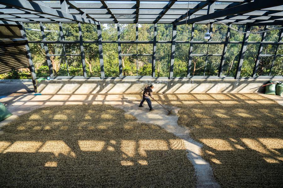 23日、臨滄市雙江県沙河郷陳家寨村のコーヒー農園でコーヒー豆を天日乾燥させる農家の人。(臨滄=新華社記者/高咏薇)