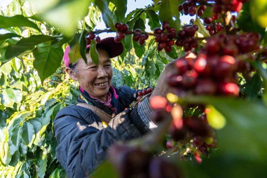 23日、臨滄市雙江県沙河郷陳家寨村のコーヒー農園でコーヒーチェリーを収穫する農家の人。(臨滄=新華社記者/高咏薇)