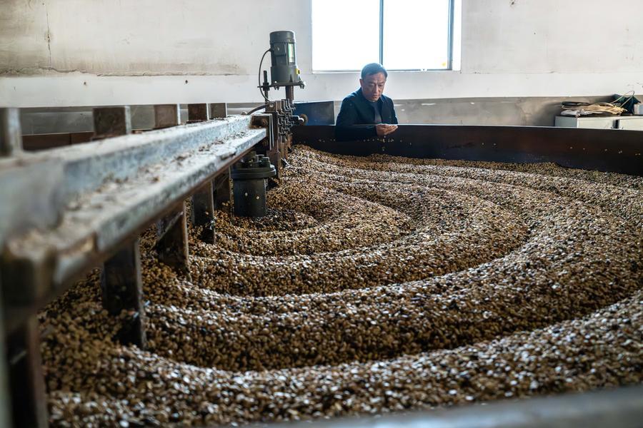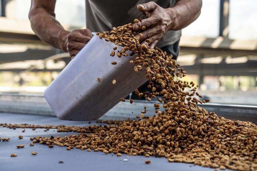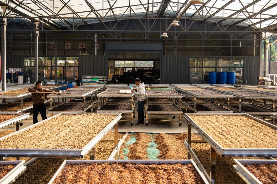 22日、臨滄市臨翔區圏內郷の雲佳コーヒー農園でコーヒー豆の処理狀況を確認する農家の人。(臨滄=新華社記者/高咏薇)